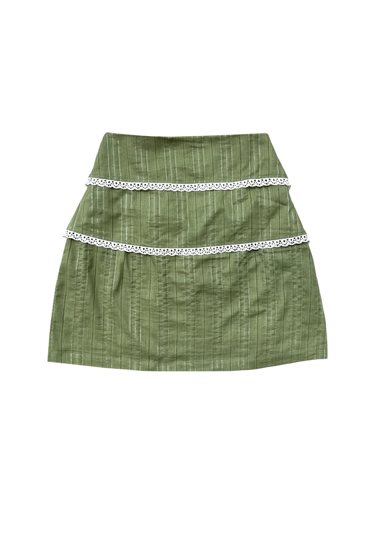 Mini skirt made on cotton fabric with subtle lines pattern. Adorn with laces detail on the front, side zipper, and elastic waist band on the back. Available in 2 sizes.