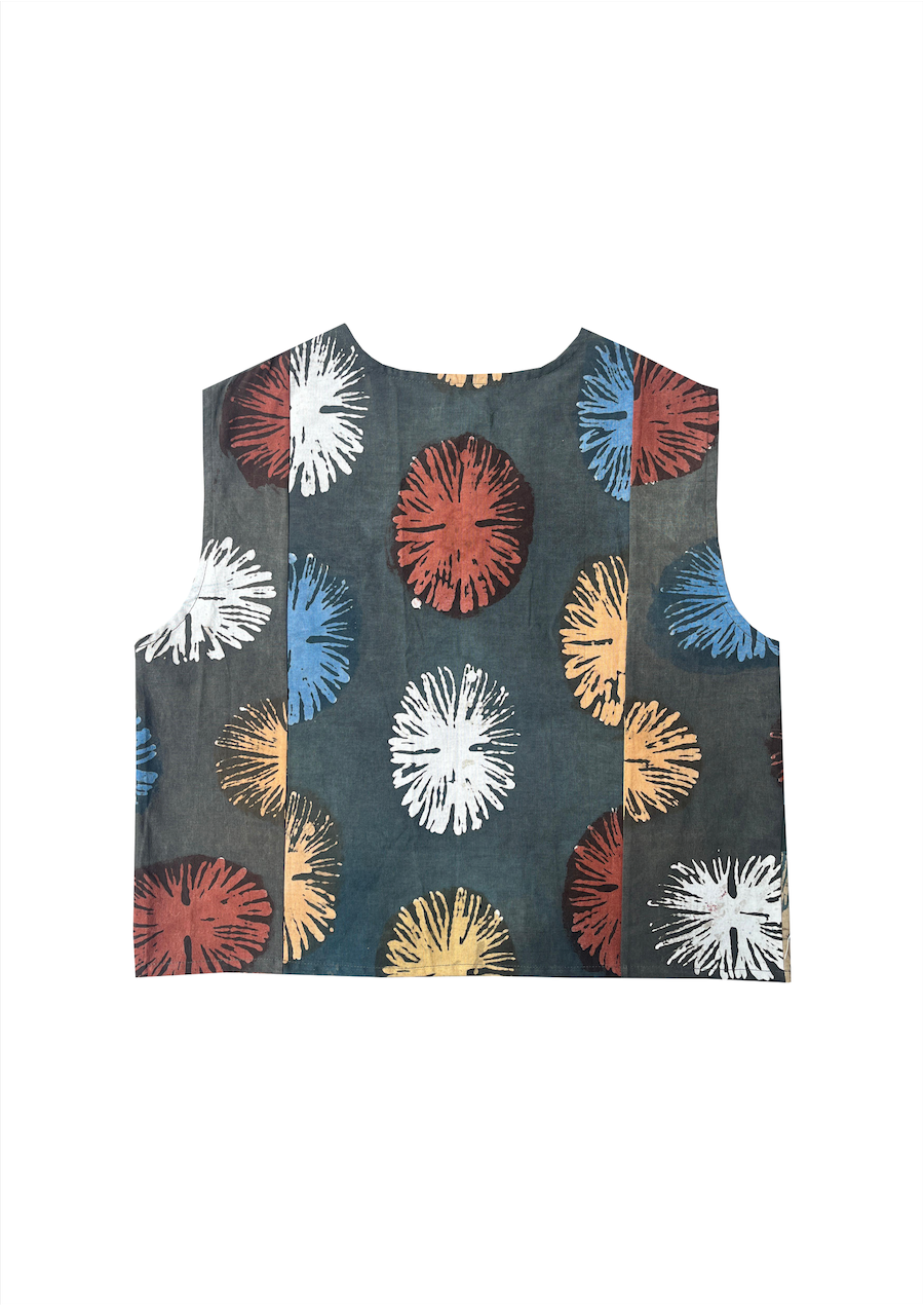 Upcycled from our Hanabi motif waste fabric, there are only two Hanabi vests created for this special occasion. It’s worn as a statement outerwear with panel detailing and a one-button closing. Naturally dyed with plants and roots.